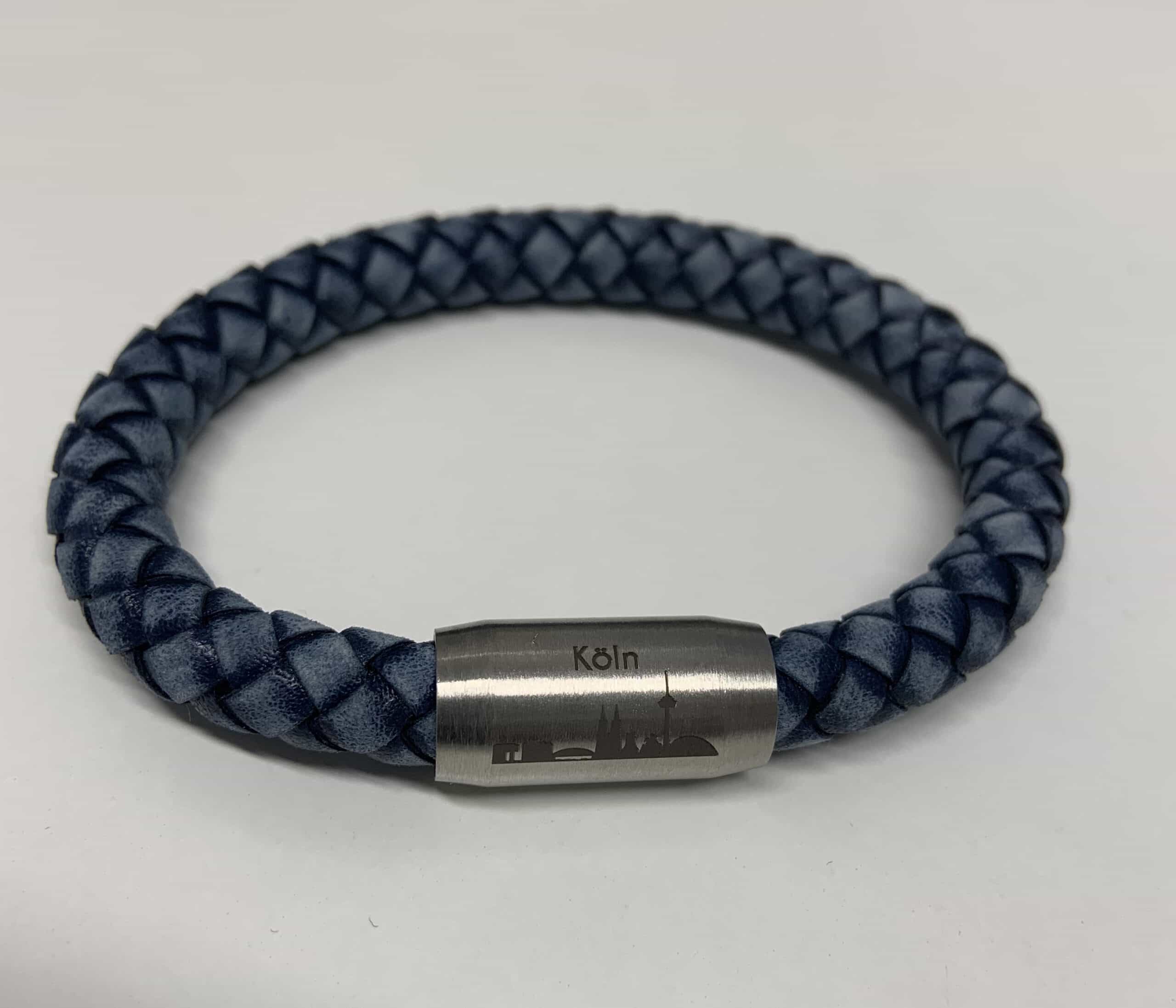 Lederarmband mit Magnetschließe in Edelstahl und Skyline mit Aufschrift Köln.