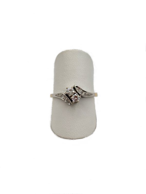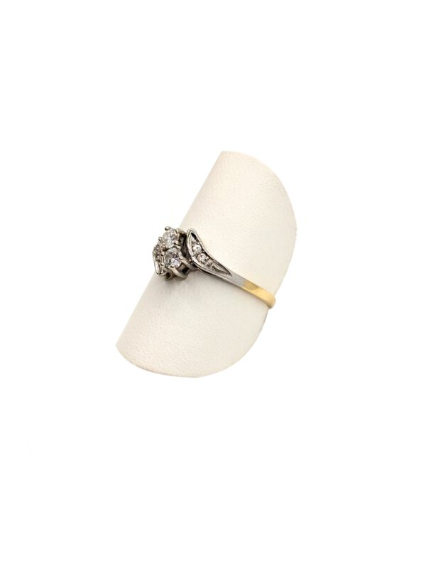 Dieser 585/000er zweifarbiger Ring im Artdeco Stil ist im oberen teil in Weißgold gearbeitet , ist mit 2x größeren und 4x kleineren Diamanten ausgefasst. Der Ring hat die Größe 55 und der Ring wird nach unten hin an der Schiene etwas schmäler.