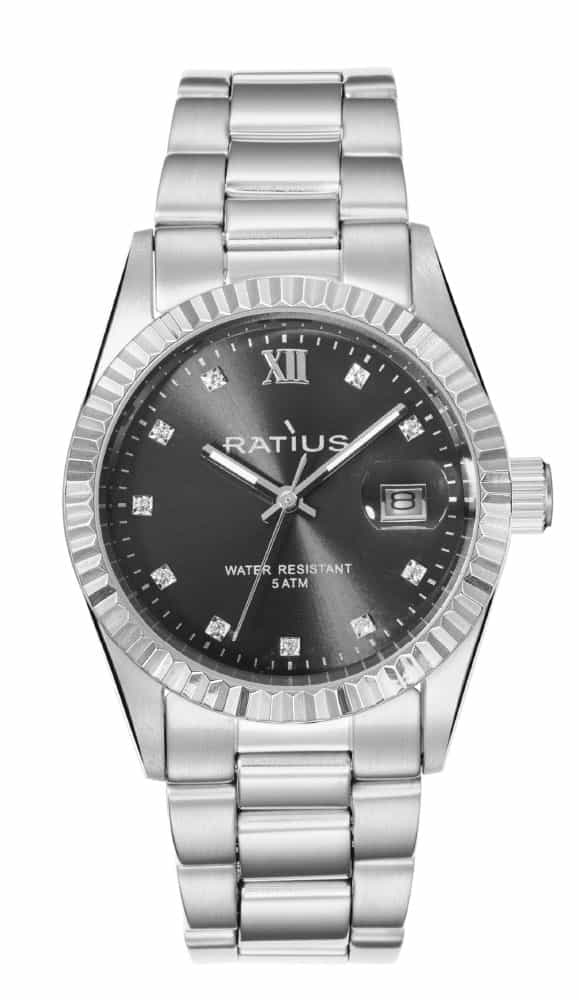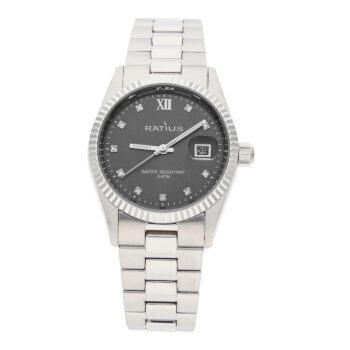 Ein echtes Schmuckstück bei dieser Ratius Damenuhr sind die strahlenden Schmucksteine im Zifferblatt, denn diese verleihen der Uhr einen eleganten Touch. Das dunkle-schwarze Zifferblatt (Farbton kann vom Foto abweichen), hat eine Datumsanzeige auf drei Uhr mit einer Lupe, damit Sie das Datum perfekt ablesen können. Die elegante Quarzuhr für Damen und Herren ist aus massiven Edelstahl hergestellt und hat eine polierte und mattierte Oberfläche. Mit der Butterfly Schließe haben Sie einen sicheren und stabilen Verschluss für Ihre Armbanduhr. Ein modernes und elegantes Accessoire für jeden Anlass und Sie können die Uhr auch ohne Probleme täglich tragen.
