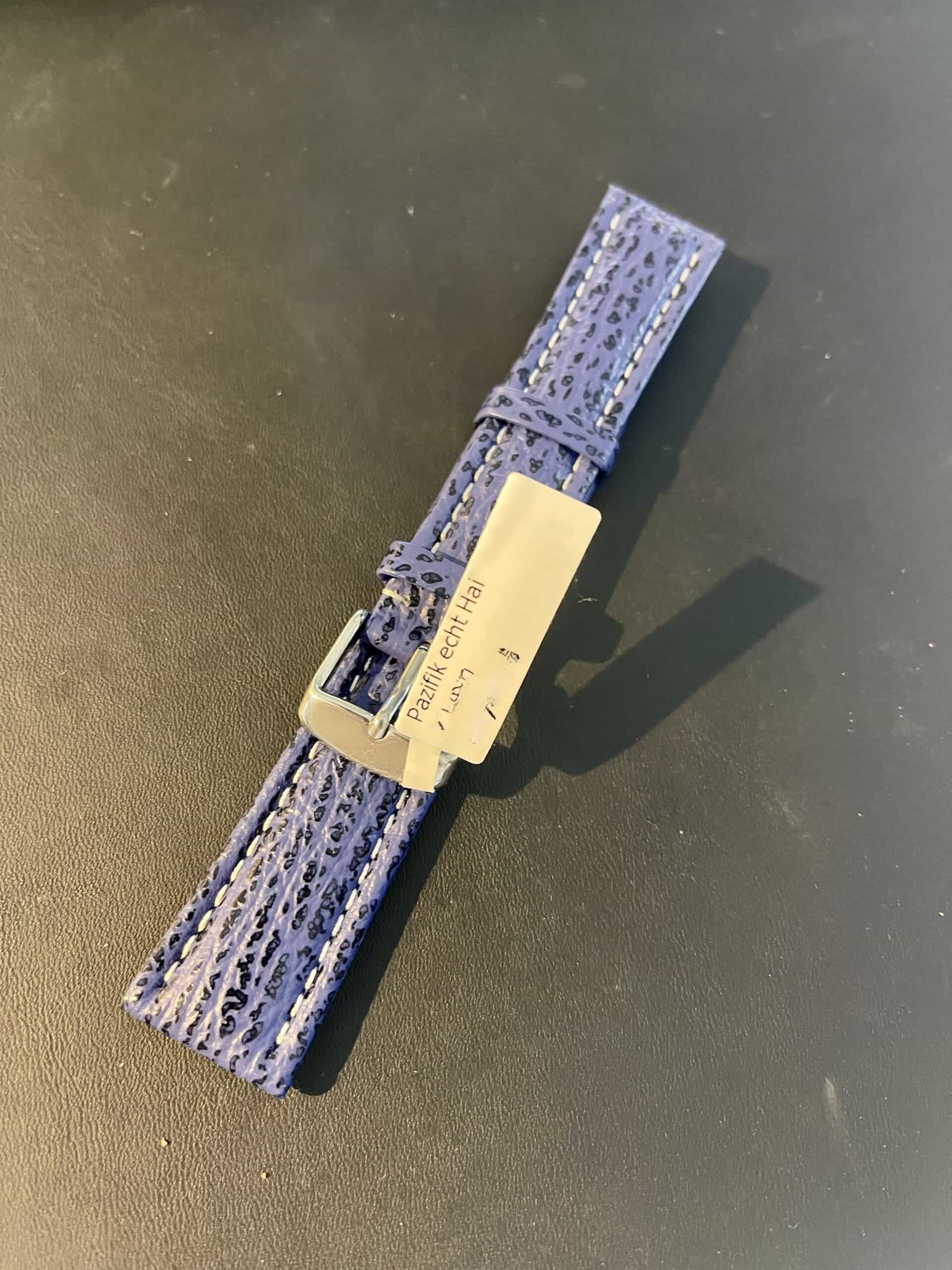 Lederband Pazifik für Uhren. Echt Hai in blau. Weiße Naht.
